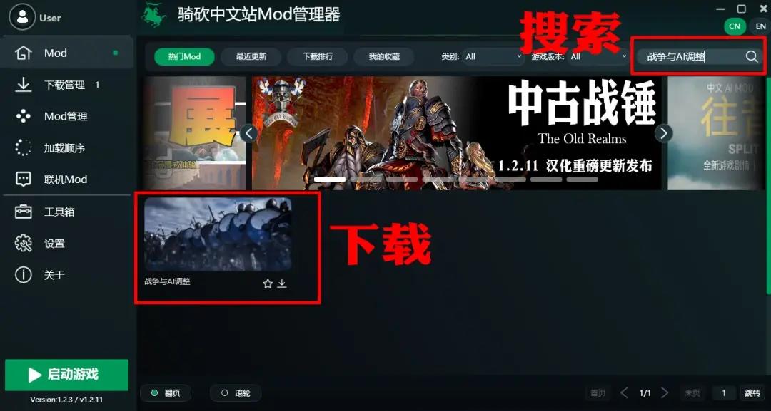 也可以直接百度搜索“騎砍中文站 下載中心”,進入下載站後搜索“戰爭與AI調整”進行下載。