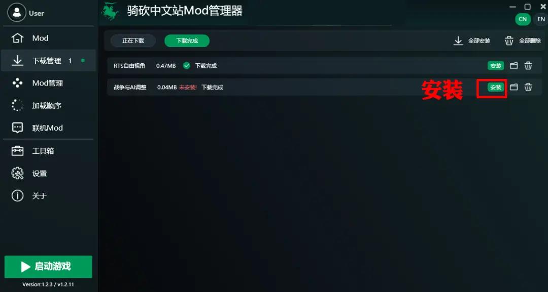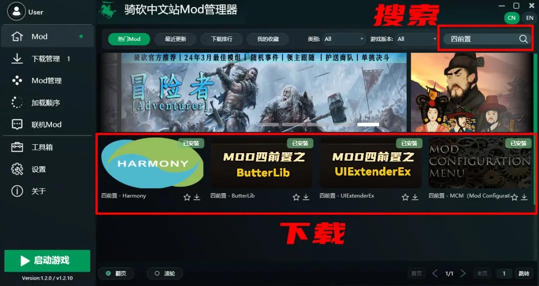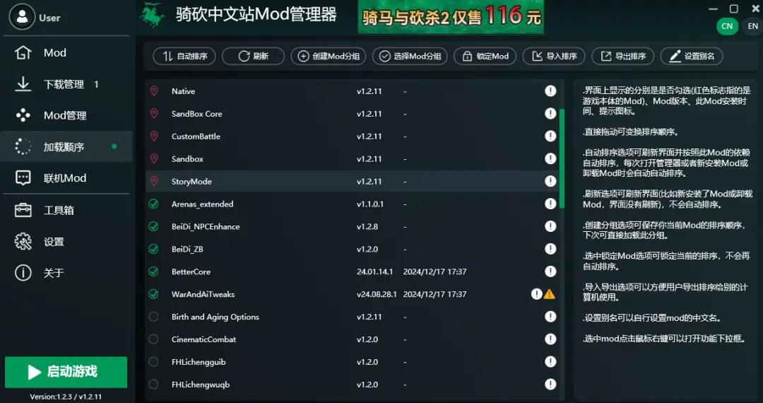 1、打開騎砍中文站的MOD管理器,下載與瞭解管理器詳情可以瀏覽【官方推薦】全網MOD一鍵安裝的神級工具《騎砍中文站Mod管理器》V1.01正式版發佈