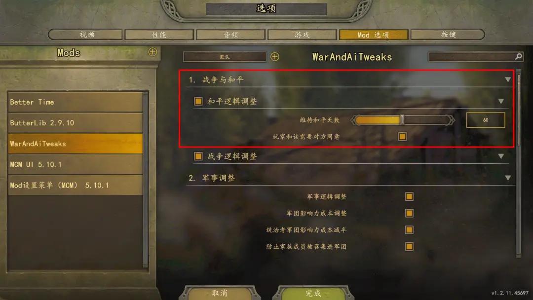 在與外交大修MOD一同使用時,需要在菜單裏,將養精蓄銳天數與外交MOD裏設置的和平天數對應上。