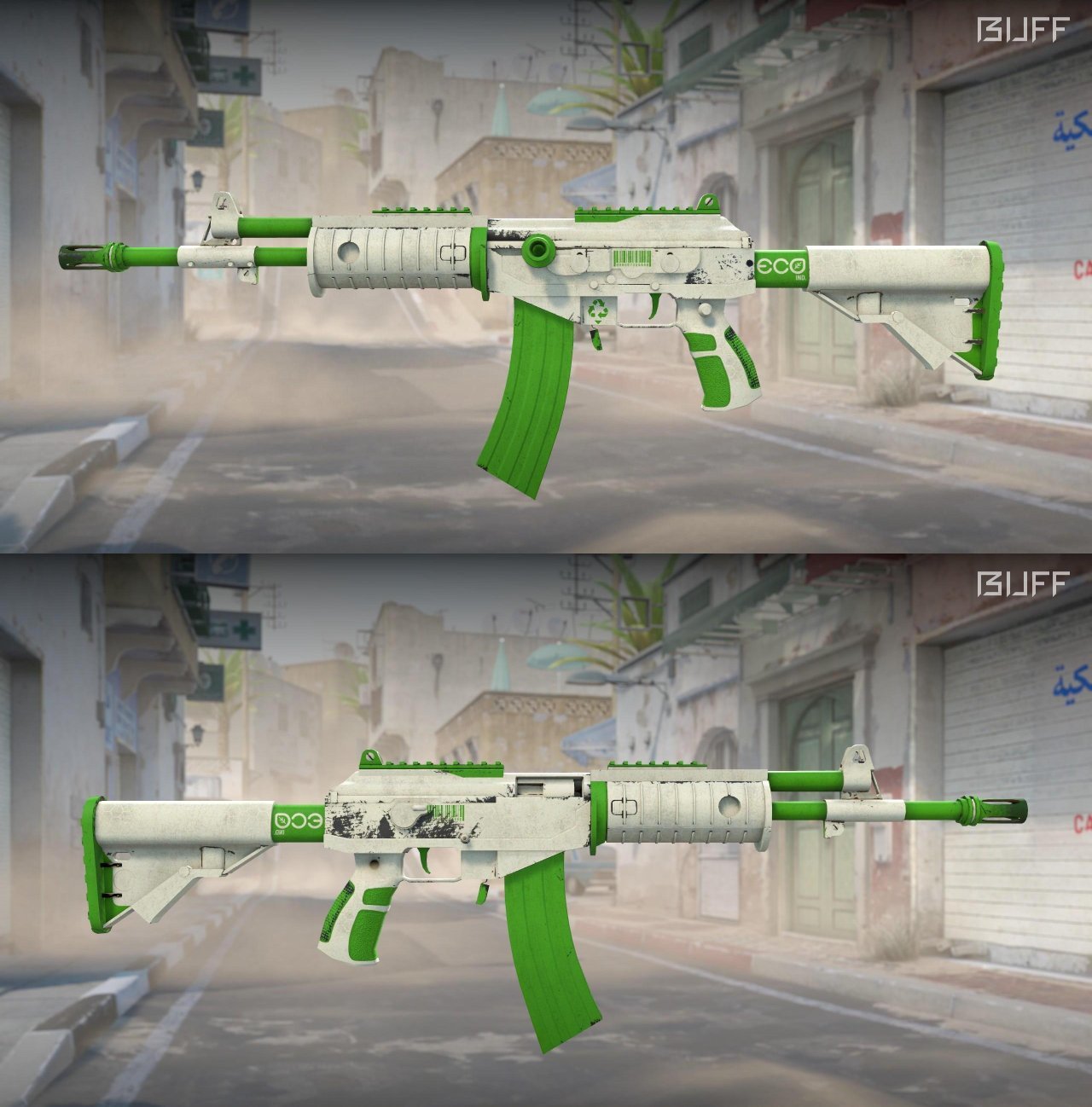 同样作为一款系列皮肤,具体特点就不做过多介绍了,整体上是绿白的配色,枪托上还有“eco”的字样🤔,局内效果很不错,很吃磨损,推荐去入手极限久经这样瑕疵会比较少,暗金(77)