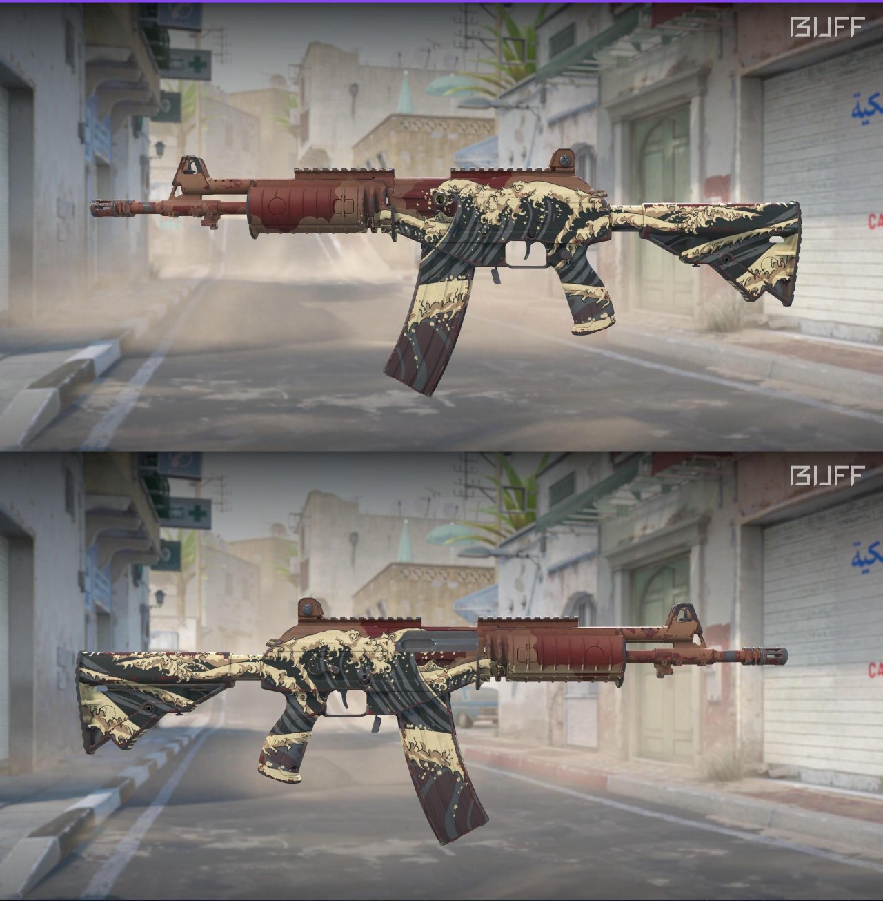 如名,枪身上一场海啸的场景,背景选择了红色,看起来更有感觉了,而且不同模板的海啸样子不一样的哦,有些吃磨损,亮度也会受一些影响,推荐略磨入手,可考虑暗金(31)