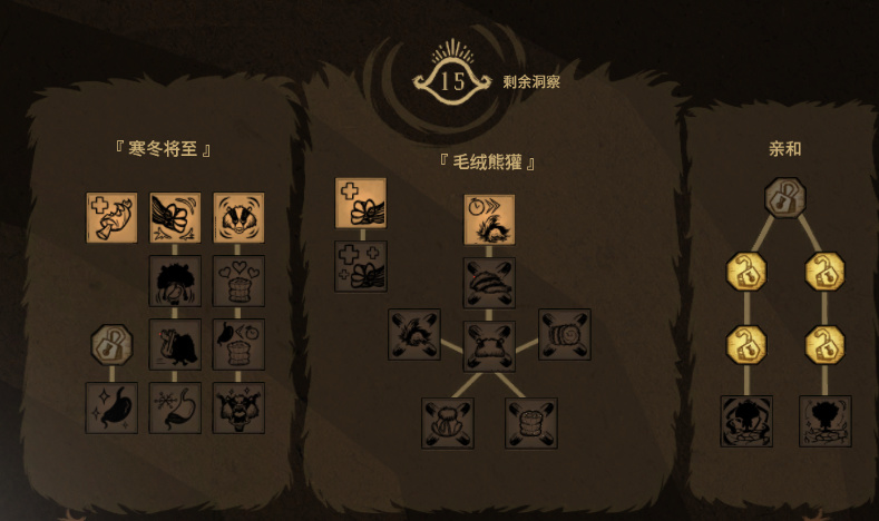 中間第一個技能是冬眠怒衛,在冬季時,當飽腹時,可以增加10點位面防禦,近戰傷害變爲兩倍。