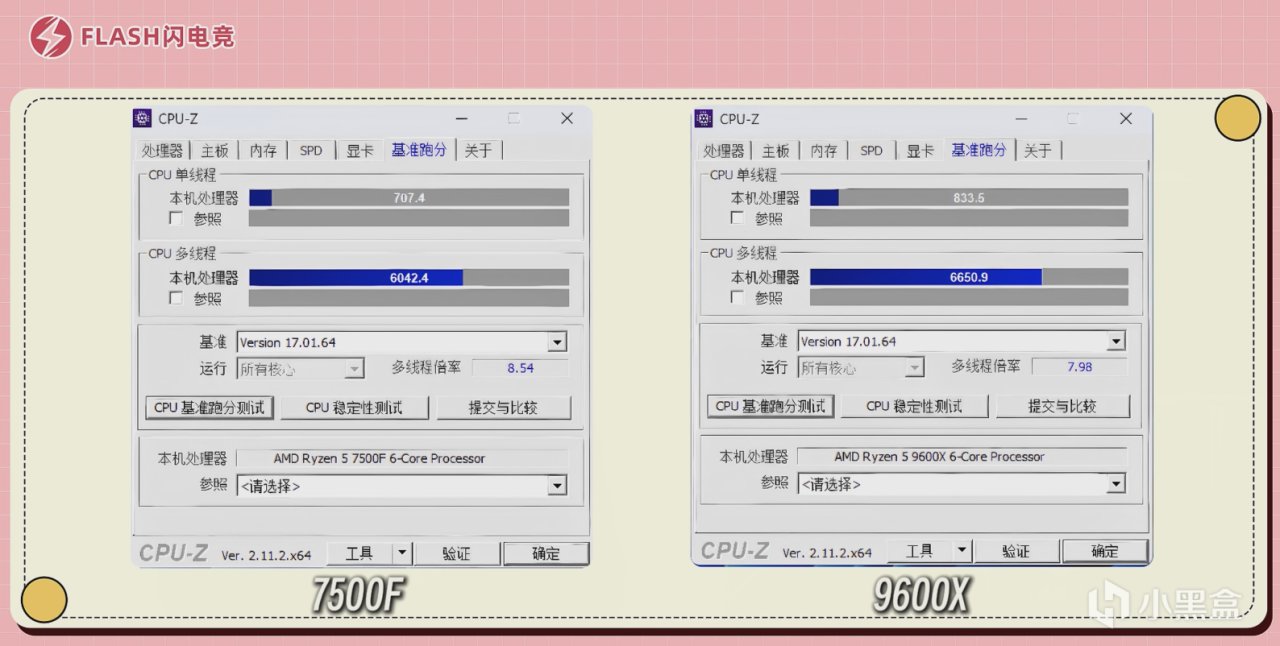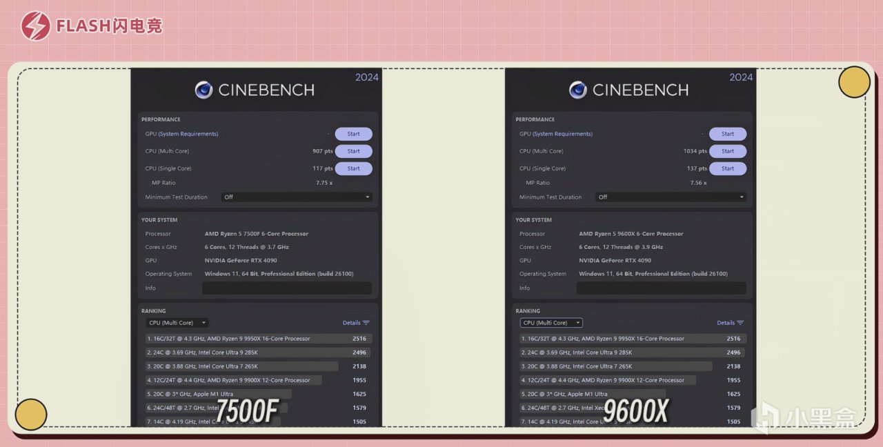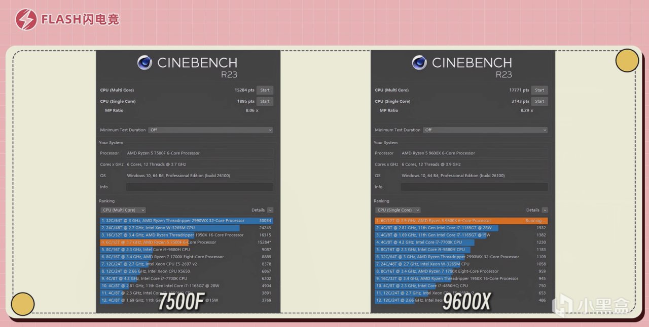 從理論測試成績綜合來看,9600X在單核性能要領先7500F約15%,多核的成績也要領先7500F約10.66%。