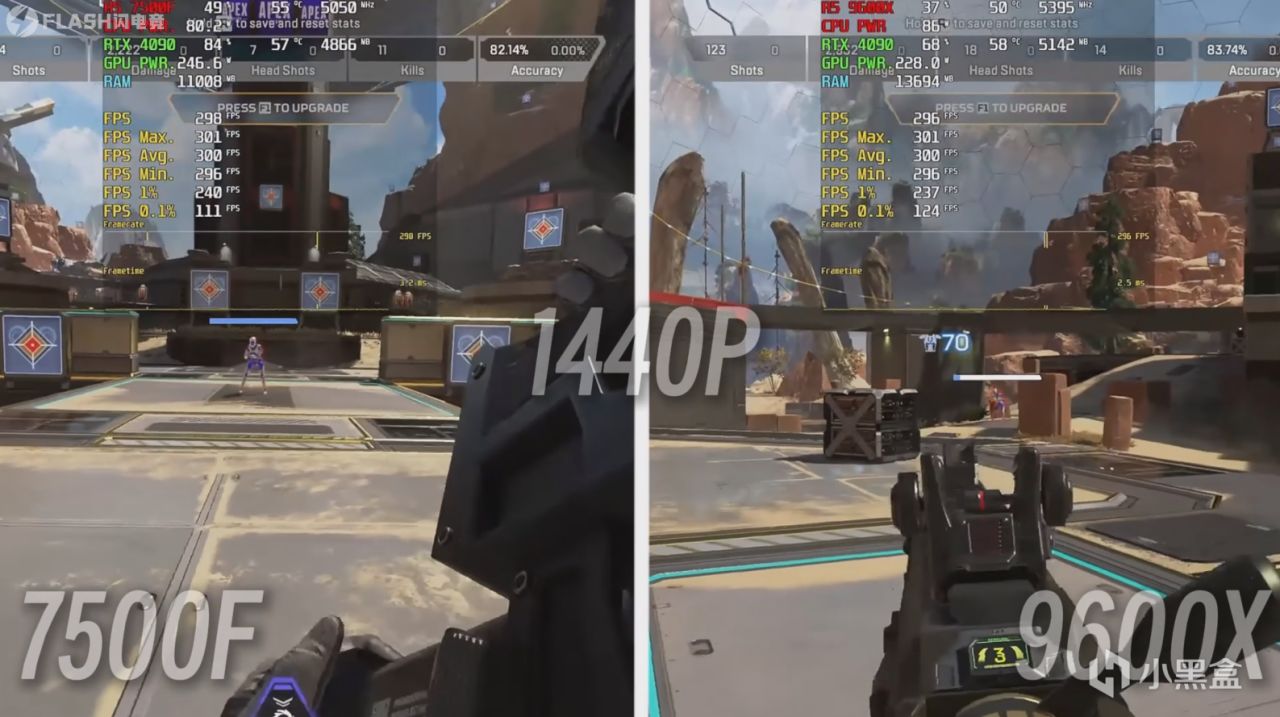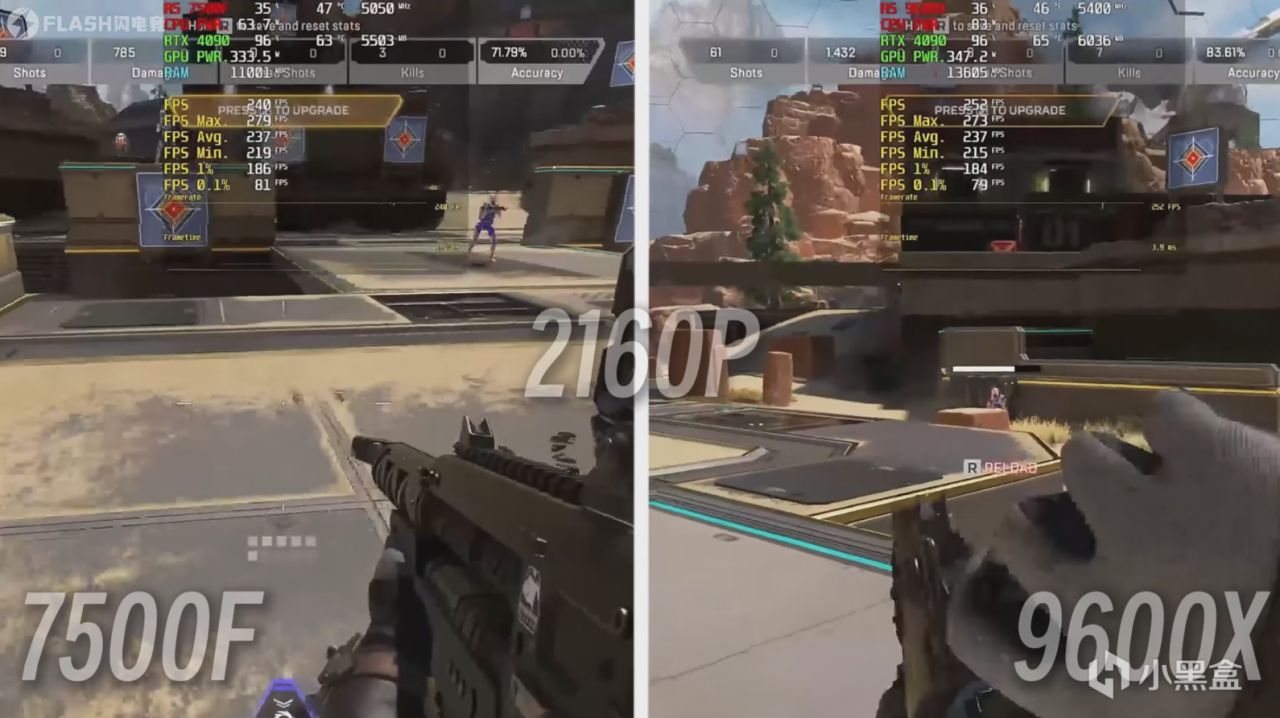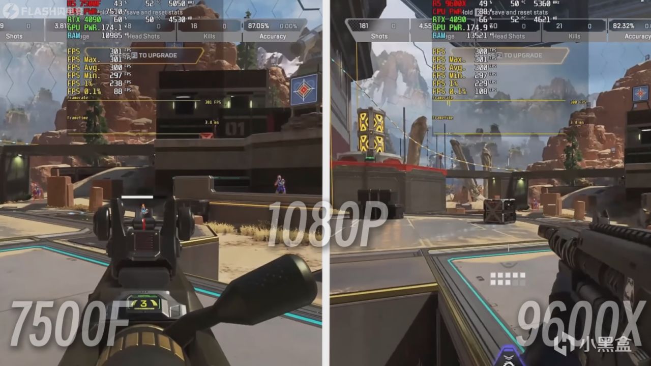 在《APEX》中,因爲這個遊戲的幀數上限就是300幀,在1080P與2K分辨率最高畫質下,2顆CPU的幀數都跑到了300幀的上限,
