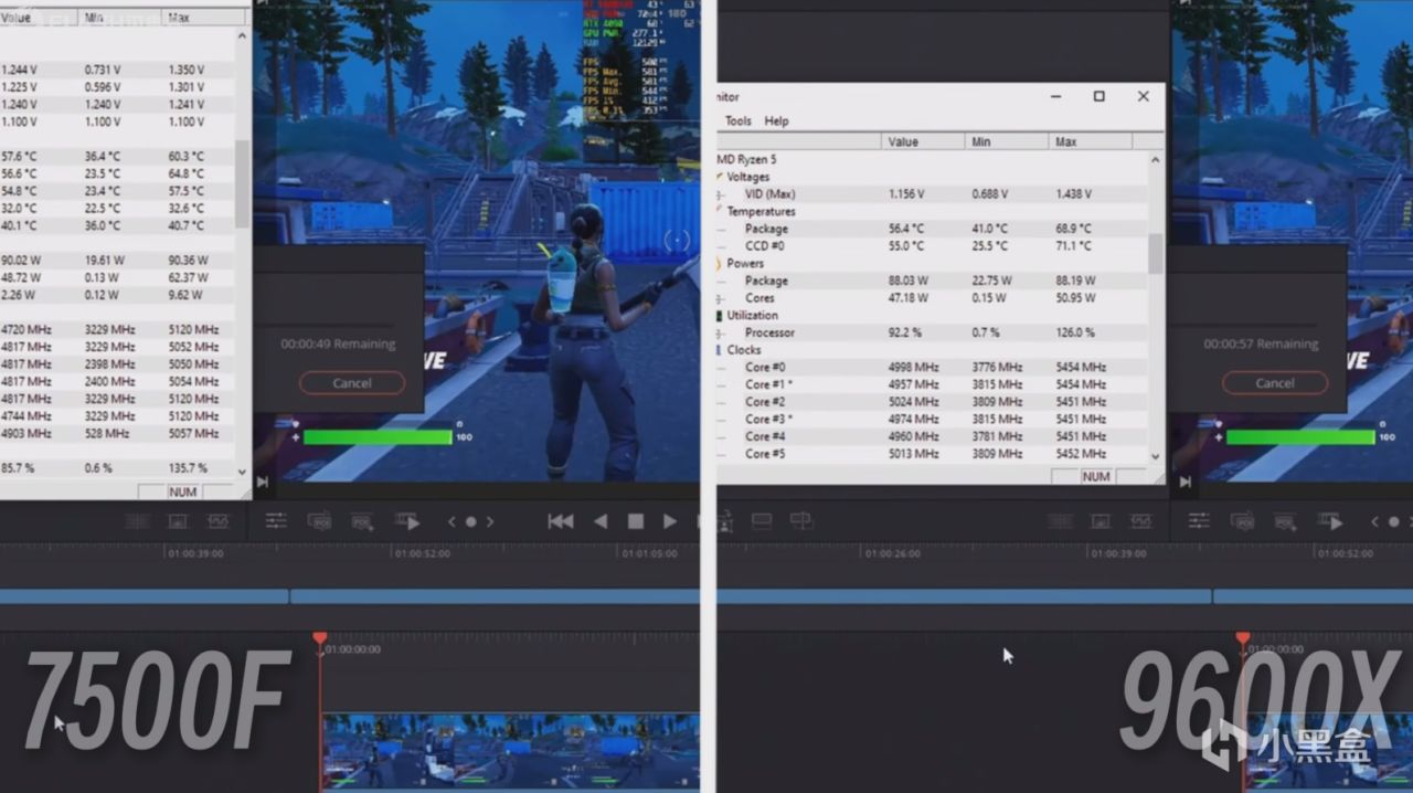 在生產力方面,2顆CPU均爲6核12線程,所以在達芬奇導出相同時長的4K文章,結果也差不了多少。 在PR中結果也相同。