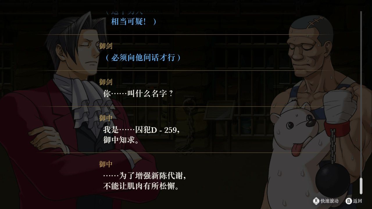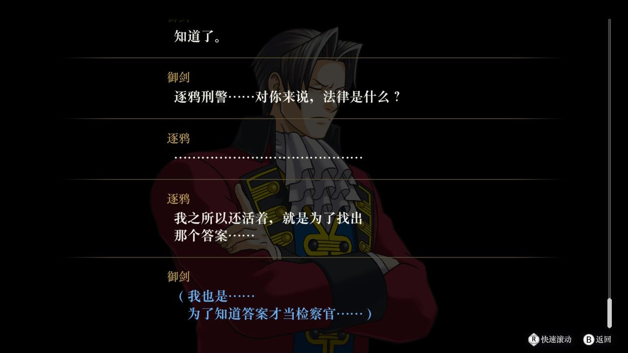在經歷了與犯罪者四十多小時的博弈後,作爲“御劍憐侍”的旅程也告一段落。本作有着系列一貫的諧音梗與緊張氣氛中穿插的幽默戲份,尤其是在2中添加的“邏輯象棋”部分作爲另外一種形式的“心靈枷鎖”,也顯得更爲合理。相較於藍色律師先生,紅色檢察官先生的故事確實更合我的口味一些,而這段故事也確實稱得上是一段有人物弧光的故事