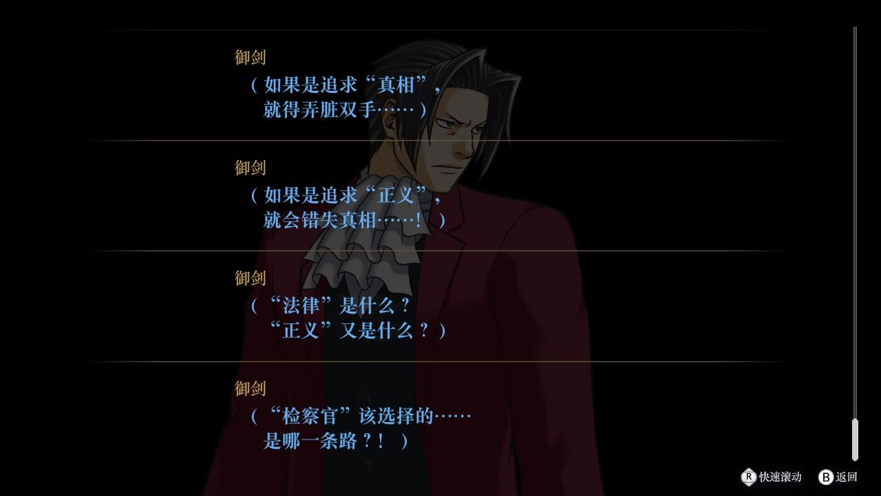 如果沒有發現矛盾之處或者忽視了一些細節,那麼詩紋就會代他受戮——甚至詩紋本人都不會覺得有什麼問題。不管是成步堂的故事還是御劍憐侍的故事,我們總會覺得有些對手就是強行解釋,或者是胡攪蠻纏,但是請想一想,有些細節可能執法人員確實沒有注意到。法律要給當事人交代,但給出的交代並非抵達真相後的交代。他們並非真的胡攪蠻纏,而是他們認定自己心中的答案,踐行自己心中的“法律”,只不過確實沒有抵達“真相”,所以: