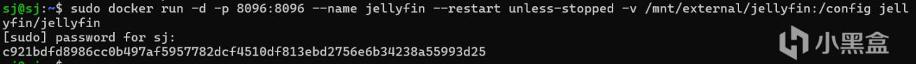 sudo docker run -d -p 8096:8096 --name jellyfin --restart unless-stopped -v /mnt/external/jellyfin:/config jellyfin/jellyfin