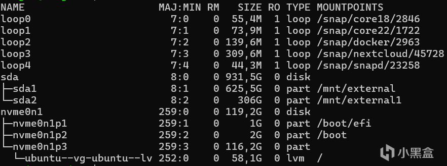 使用lsblk来获取磁盘信息,可以看到有两个挂载,我们忽视external1因为我之前挂在过忘记删了
