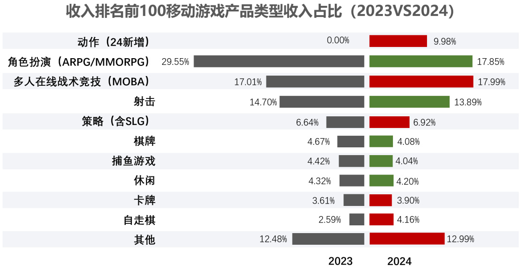 從品類的角度看,一個顯著的變化是動作遊戲增長迅猛——它被從原本角色扮演之類更爲寬泛的概念中拎了出來。收入貢獻佔到了9.98%。
