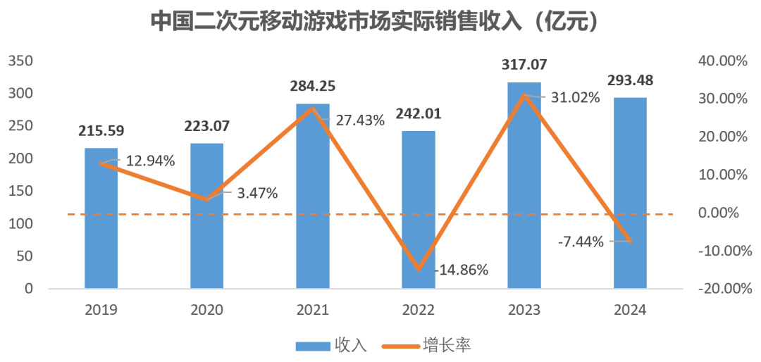 根據中國遊戲產業研究院&伽馬數據(CNG)的數據,整個二遊收入規模下降了7.44%。