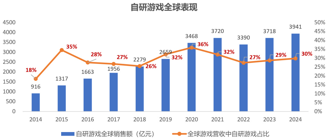 根據GamesIndustry發佈的數據,2024年全球遊戲市場總收入爲1843億美元,同比微漲0.2%。從全球遊戲行業的視角看,國產自研遊戲的比重基本維持在30%上下。