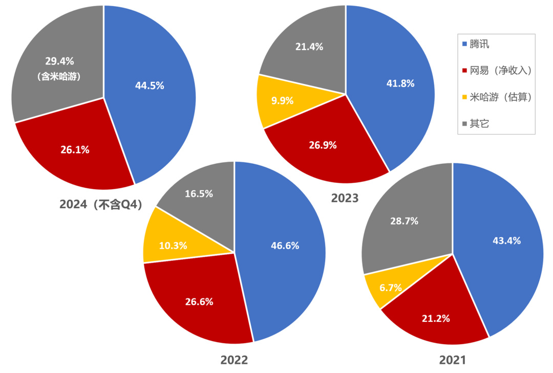 但也可以看到,頭部廠商的營收佔比依然頗高——騰訊網易兩家就牢牢抓住了70%的份額(米哈遊未上市,數據源可信度不高,僅作參考)。