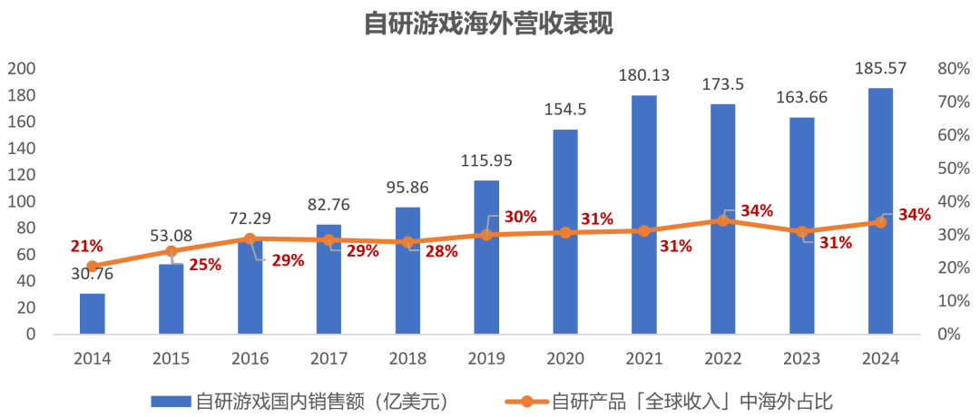 出海方面,在經歷了2年的下降後,國產自研遊戲海外營收額在24年達到歷史新高,185.57億美元。海外營收在自研產品的「全球收入」中佔比約34%,與22年持平。
