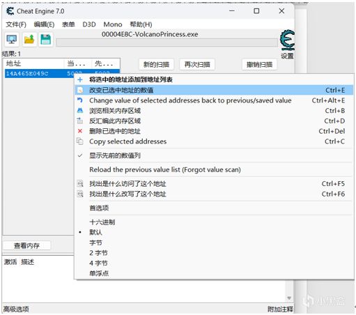 在數值上面點擊右鍵,改變選中地址的值爲你想要的數字。