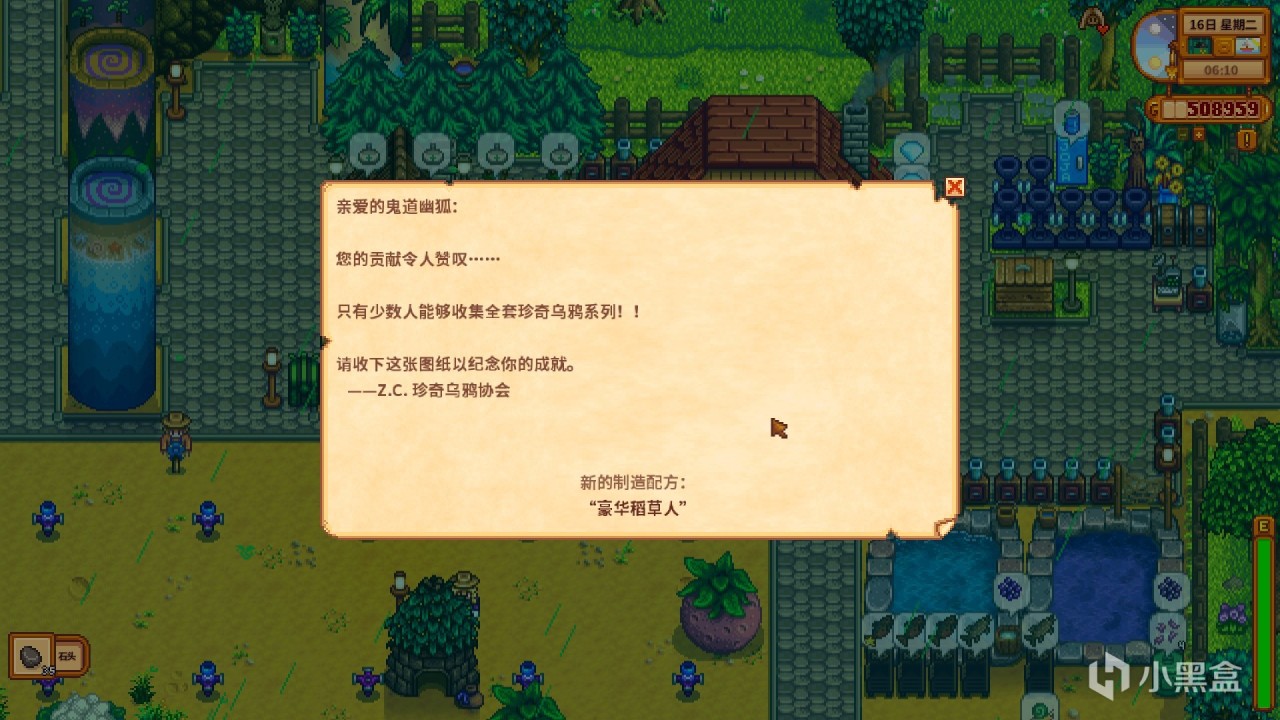 ①有八種外觀不同的“珍奇烏鴉”,全部收集會收到信件解鎖豪華稻草人的打造配方。