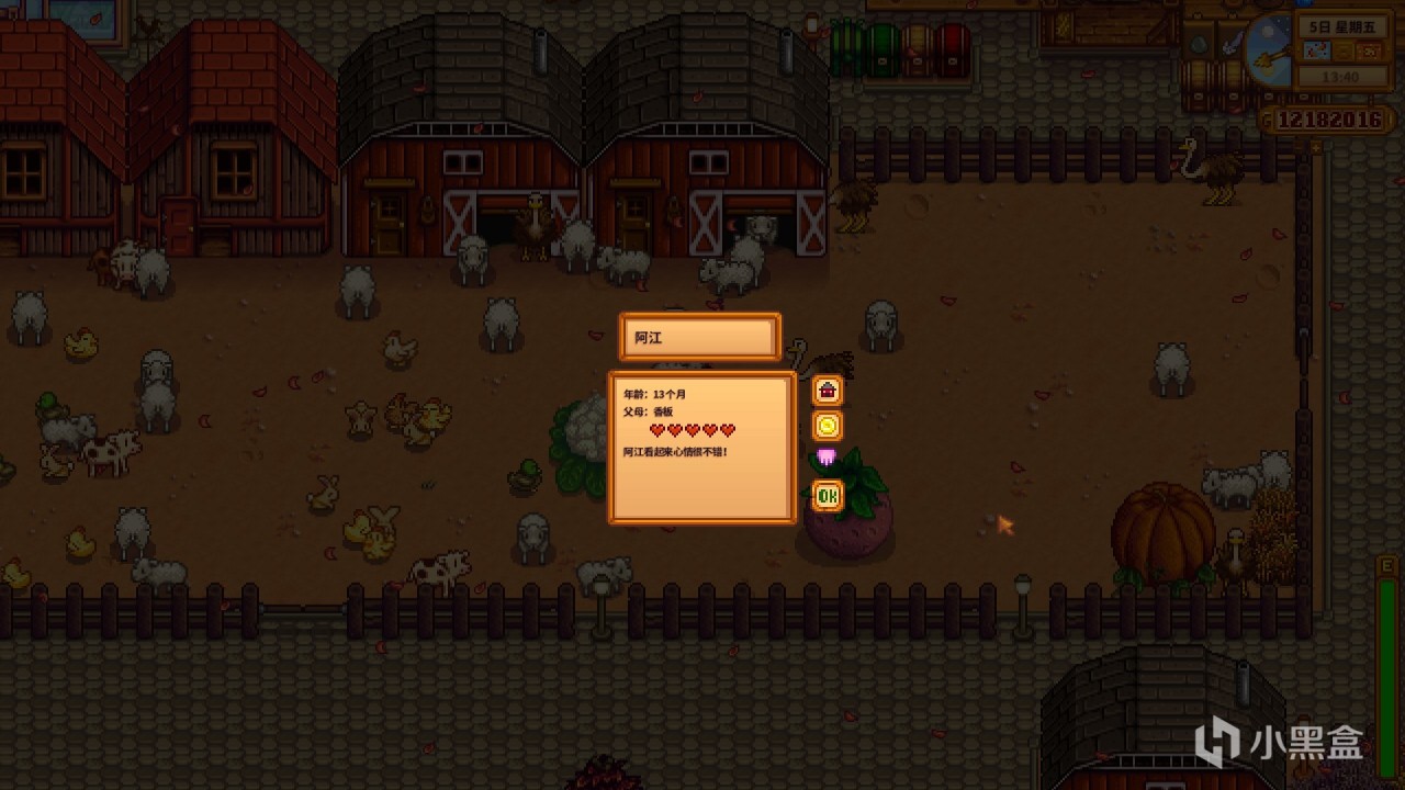 ③心情和友誼值一樣,影響動物產出。撫摸動物,讓動物去外面喫青草,在冬季放置加熱器,餵食動物,晚上讓動物回家都可以增加動物心情。