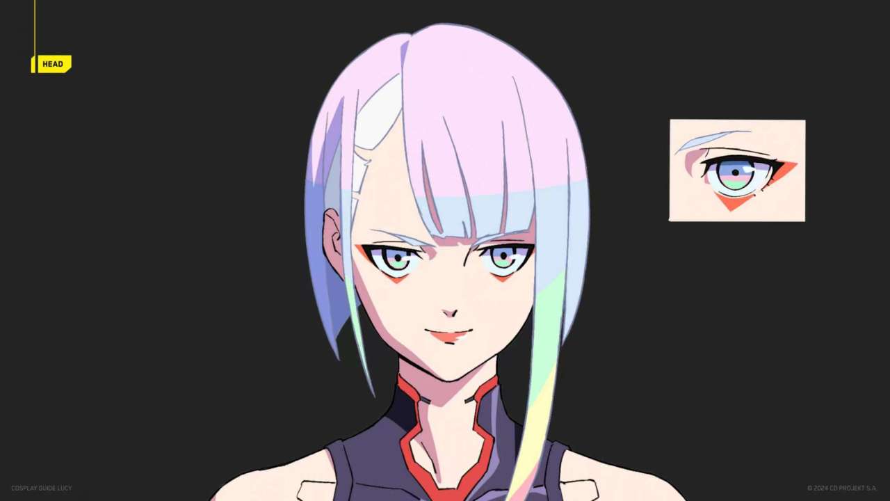 Lucy is a young woman of slender build with light skin. She has naturally white hair and red-purple eyes. She wears light red eye and lip makeup. Her hair is cut in a split bob - with her left side left longer - and dyed with a colorful pastel rainbow gradient. Her eyes appear to reflect with the colors of her hair. Her style generally follows Kitsch mixed with Neomilitarism as Lucy wears a cropped white jacket with a black netrunner leotard with red accents over a pair of white shorts and high gray stockings, and black knee-high boots. She has a deep dive port installed on the back of her scalp, that she covers with her hair.