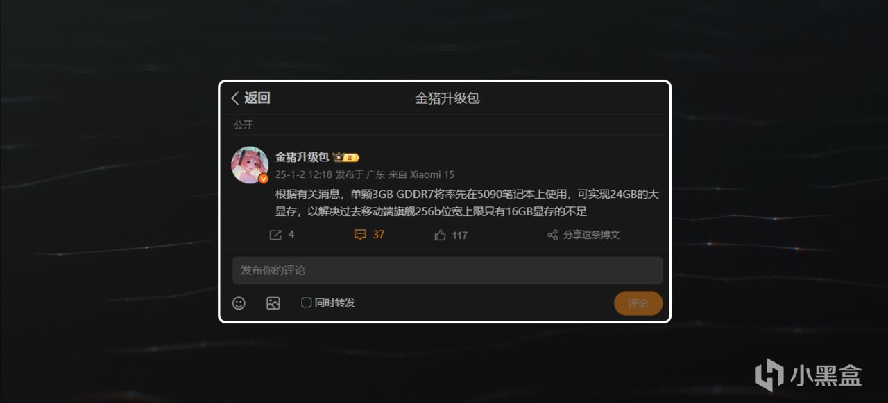 根據UP主“金豬升級包”的消息,搭載5090的筆電將會有望採用單顆3GB的GDDR7,從而解決256Bit位寬只有16GB顯存上限的窘迫。