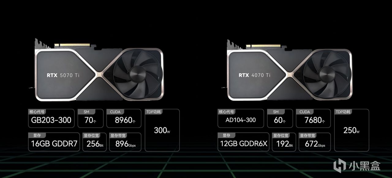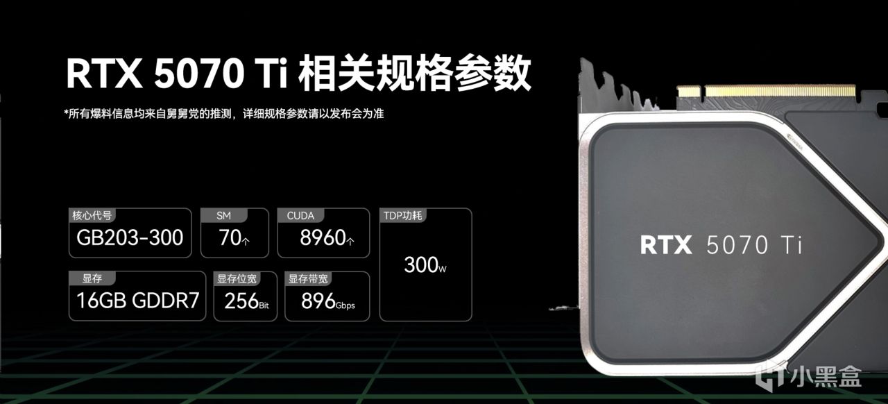 主流級RTX 5070 Ti的核心代號爲GB203-300,共計將擁有70個SM計算單元,而CUDA數量爲8960個,並配備了16GB GDDR7顯存,顯存位寬爲256Bit,顯存帶寬896GB/s,整卡TGP功耗300W。