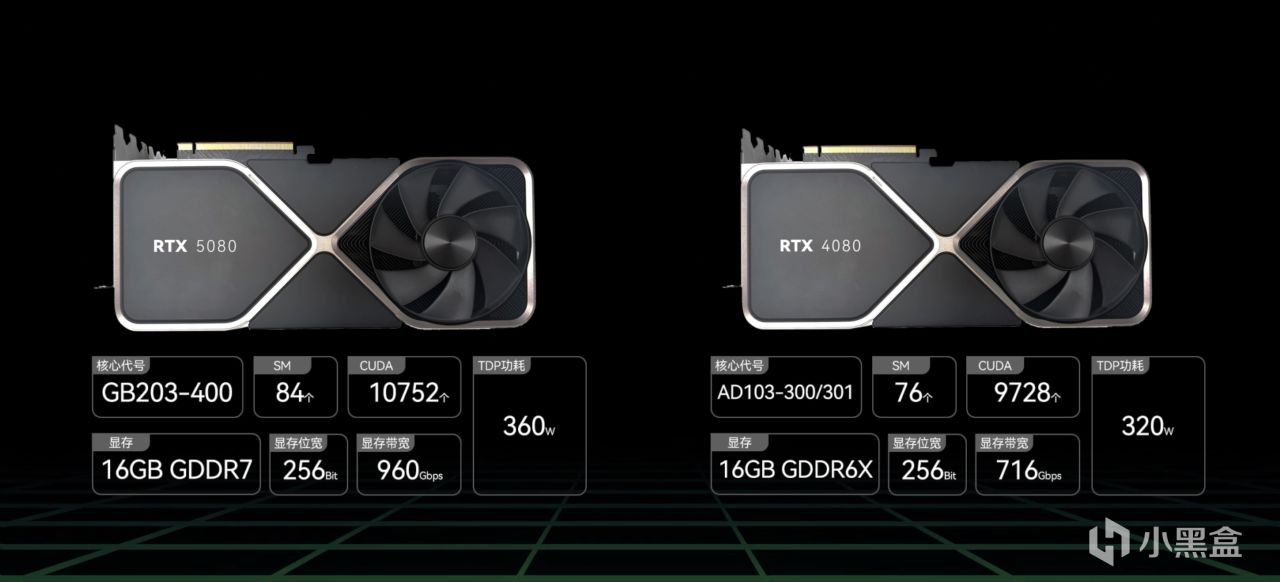 對比上一代RTX 4080,5080的CUDA數量提升了約11%,顯存依舊是採用了全新的GDDR7,整卡TGP功耗也相繼的提升了40W,整體來看,相比5090的提升並不是那麼的明顯。
