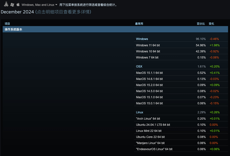 調侃歸調侃,託尼查了下 Steam 平臺在 2024 年 12 月的客戶端數據,發現MacOs ( 1.61% )的遊戲市場份額,竟然還比不上 Linux ( 2.29% )。