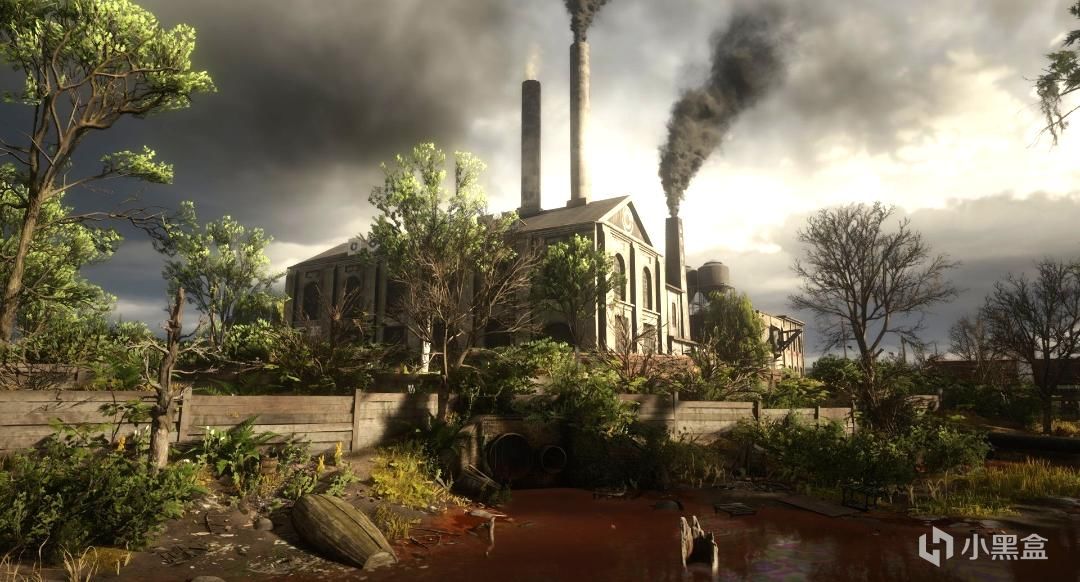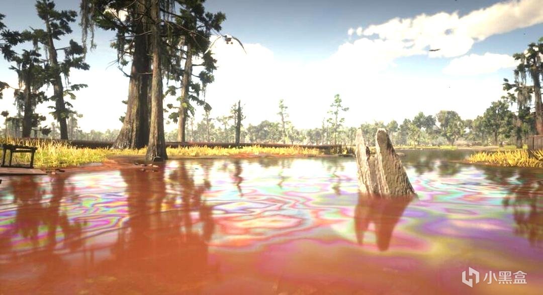 水面上有真实的油花,区域天空也被烟雾笼罩了