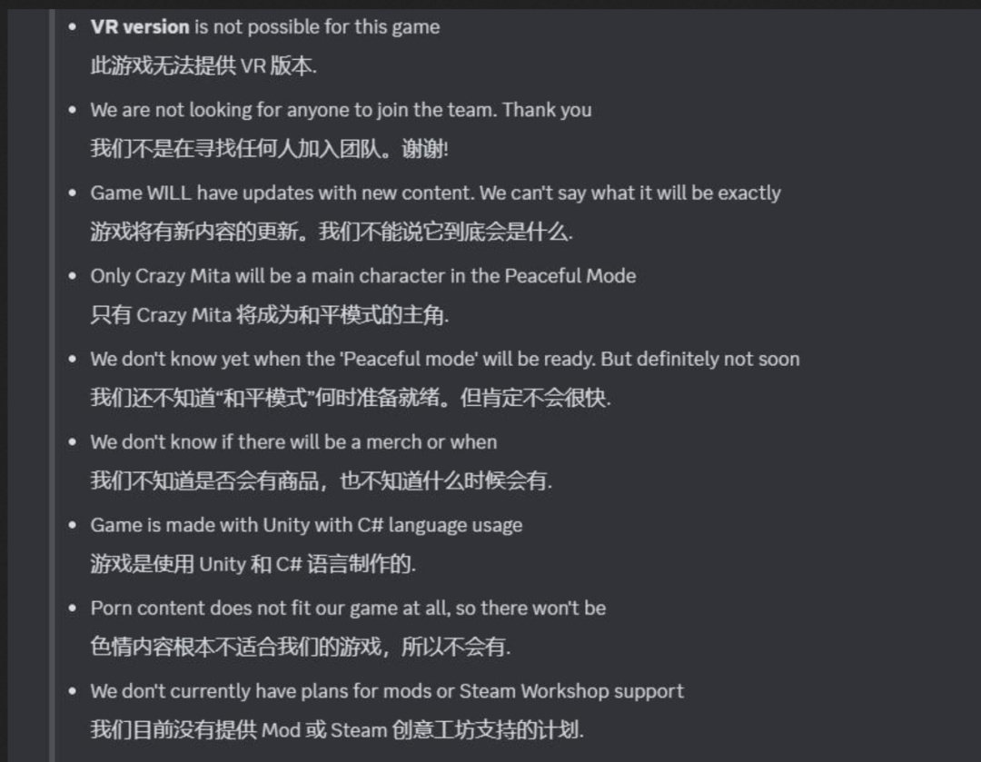 很难想象只有两个开发者居然能在游戏中塞这么多内容,并且在游戏火了之后,两个开发者Discord上认真地说明了自己的目标与任务,公开表示会持续更新、不打算听玩家建议改变最初的想法、不招人、不做VR,以及不可能加入真正的涩情内容,可以说是典型的一种民族的执着精神体现。