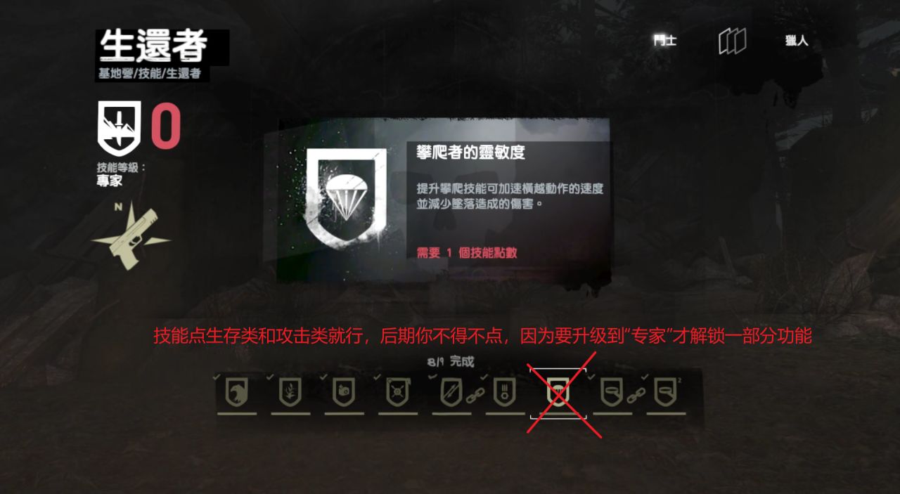 优先点加采集量和血量的技能,其他的后面会强制要求点,因为不加点升级不到“专家”,会点不出一些技能。不过技能整体影响不算很大,战斗压力比较小。