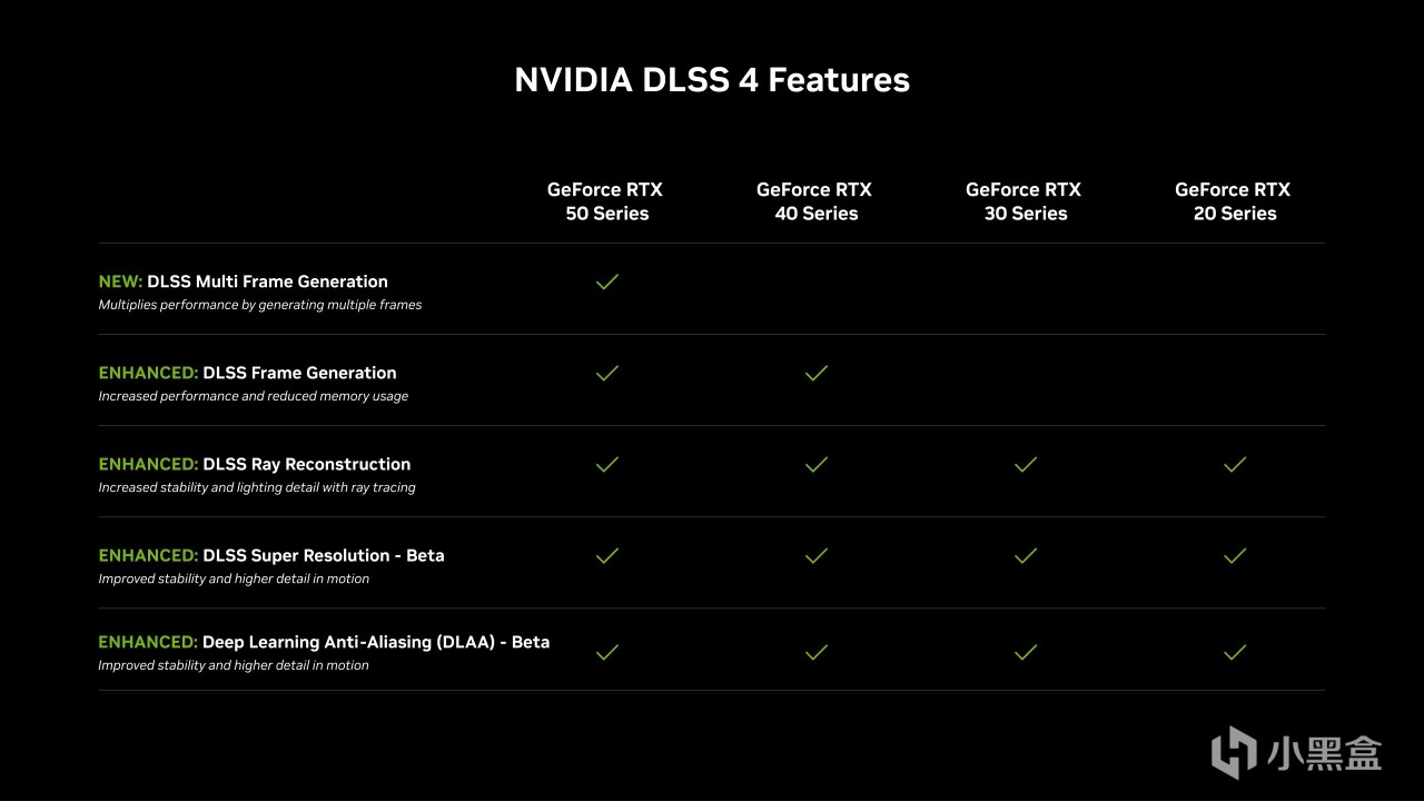 當 GeForce RTX 50 系列顯卡上架時,GeForce RTX 50 系列玩家將能夠在 75 款遊戲和應用中通過 DLSS 多幀生成技術提升性能,而所有 GeForce RTX 用戶將能在超過 50 款遊戲和應用中體驗基於 Transformer 的 DLSS 光線重建、DLSS 超級分辨率和 DLAA 技術。
