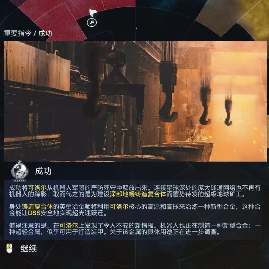 dss建造任務中在科洛爾所奪回的機器人深層地幔構造設施簡報中有提到機器人在生產更輕便更結實的金屬用於鑄造