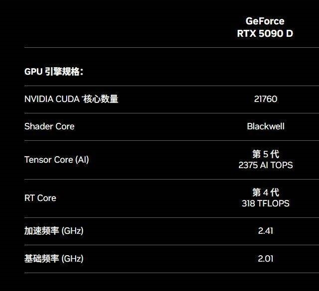 RTX 5090D依然擁有21760個CUDA核心,基礎、加速頻率也和RTX 5090一樣,分別爲2.01GHz、2.41GHz,顯存也是32GB GDDR7。只是AI性能從3352 TOPS縮減到2375 TOPS。