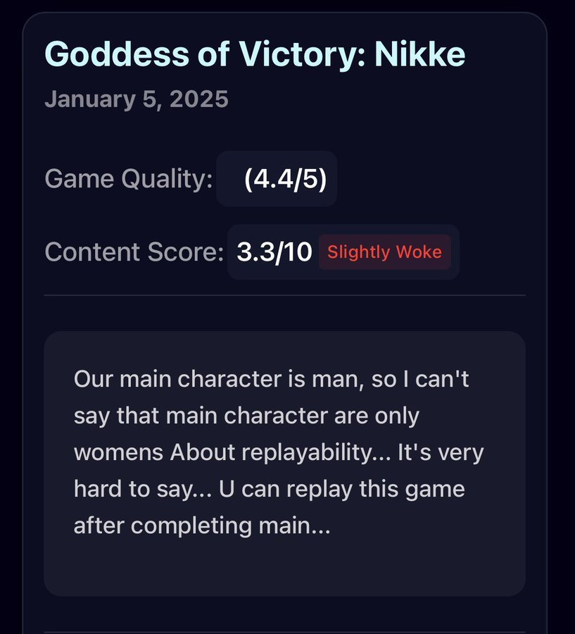 该网站允许用户阅读关于游戏在 DEI 实践方面表现的评测,基本上是在告诉玩家一款游戏“有多觉醒”(Woke),该网站使用0-10分的评分系统,没有DEI特性的游戏会得到负分,而包含更多DEI元素的游戏得分更高(5分及以上)。此外,网站还提供一个投票系统,用户可以对评测的准确性进行投票。