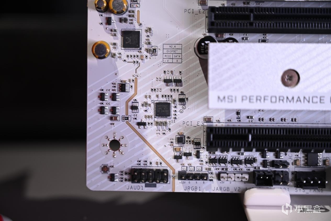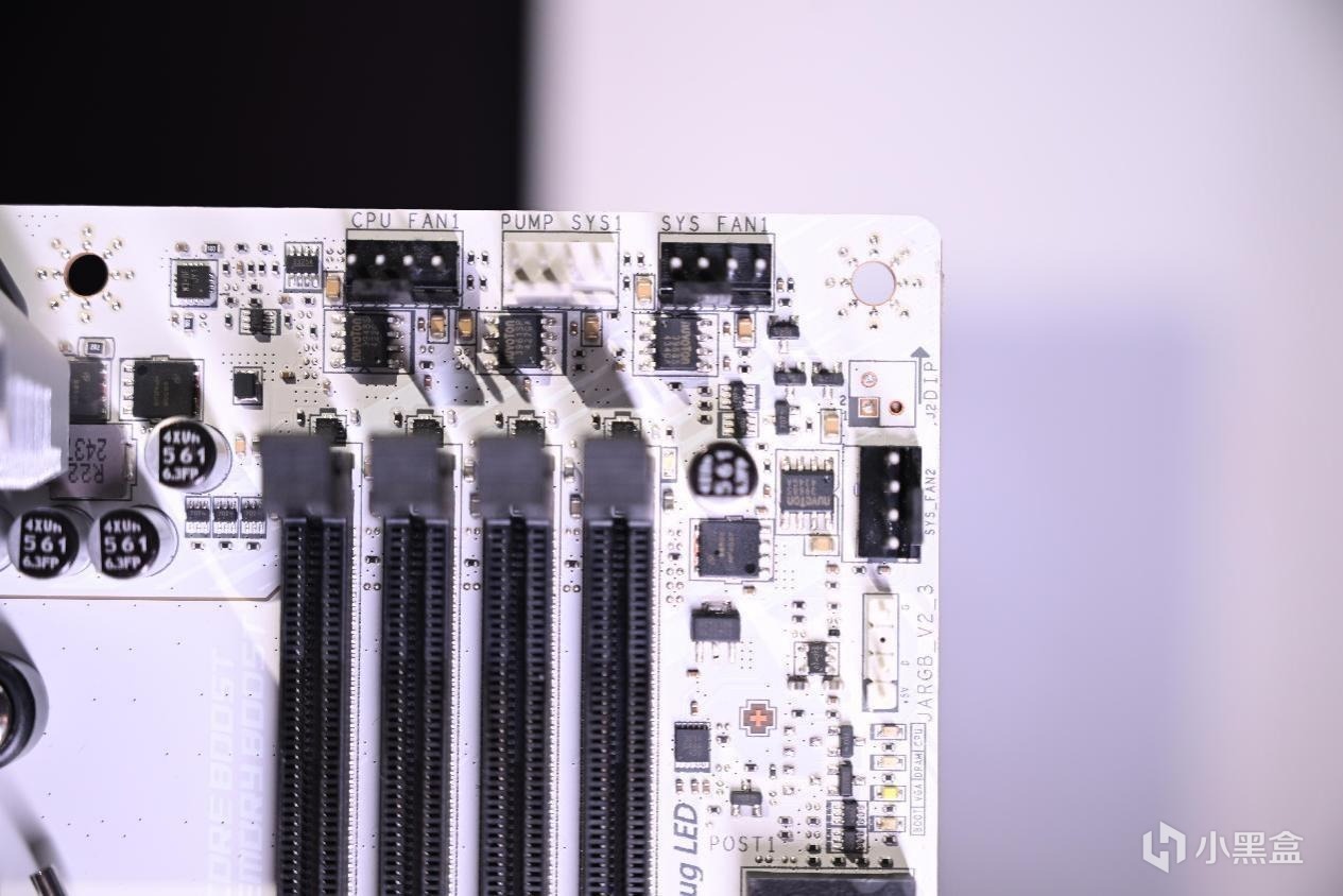主板左上角共有1个CPU散热器、1个水冷散热器、2个机箱封锁插槽和一个5v3针ARGB灯光线插槽,再往下是4个自检debug灯和debug数显。