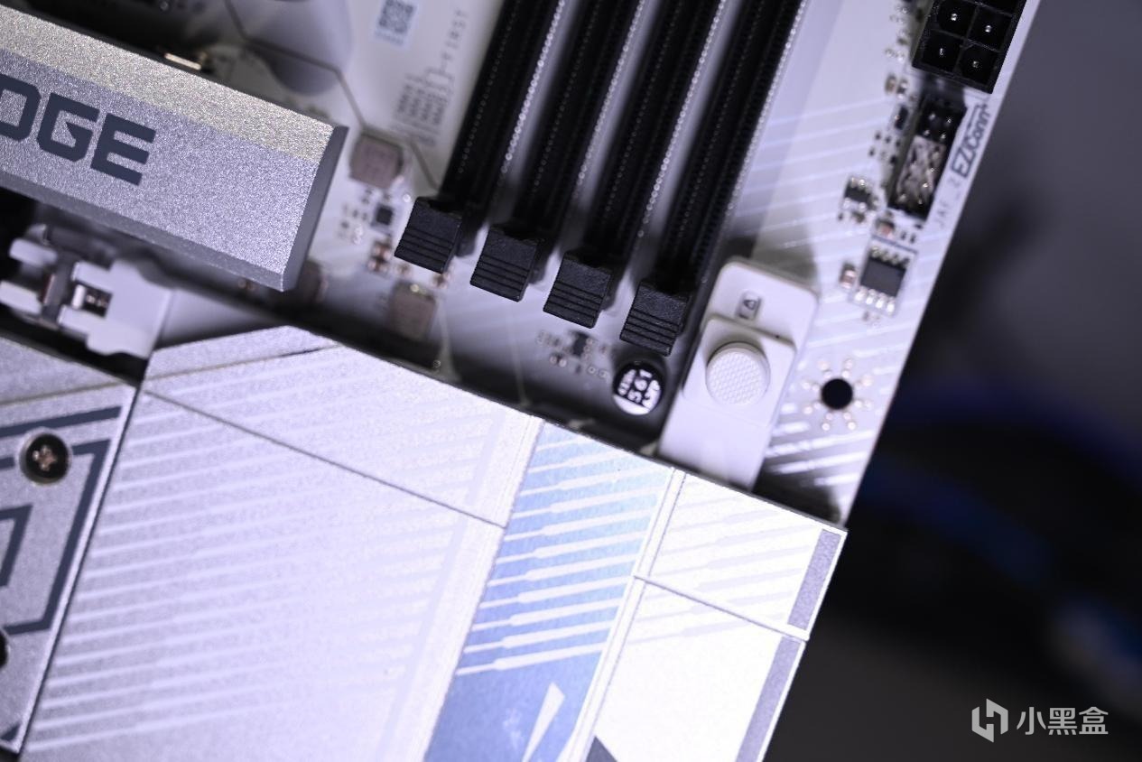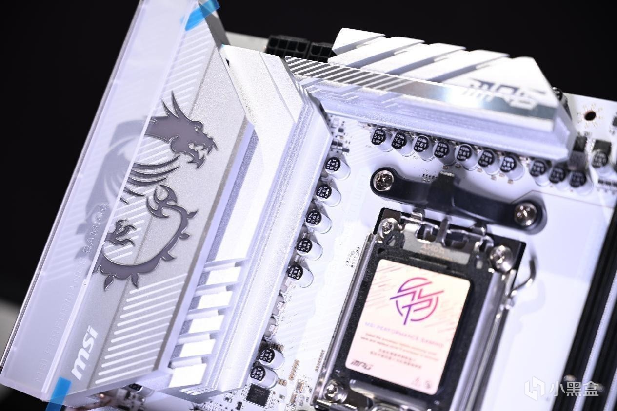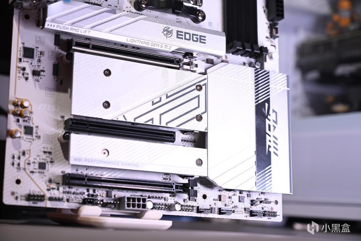 打开盒子以后各位可以看到这一代B850的外观设计,银白色的散热装甲和PCB构成了刀锋钛最独特的识别特征,底部还多出了一个8pin接口用于对PCIe插槽辅助供电。各位可以看到微星MPG B850 EDGE TI WIFI依然沿用了传统的ATX构型和微星刀锋钛系列的家族式设计语言,包括寒霜散热装甲和银色龙盾徽记。