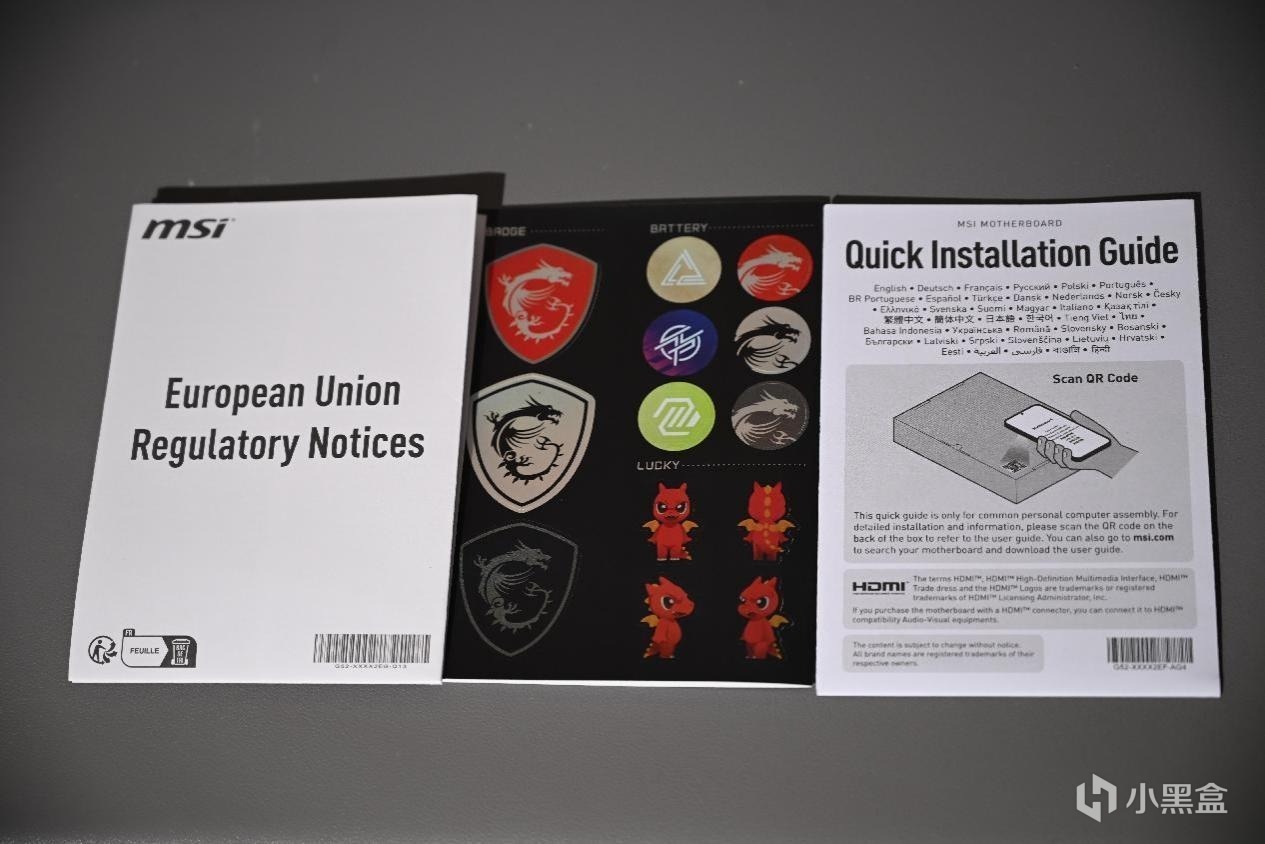 主板附件4:欧盟环保文档、微星贴纸、快速安装指南;