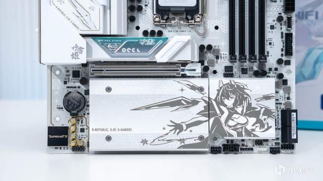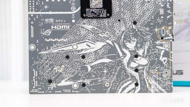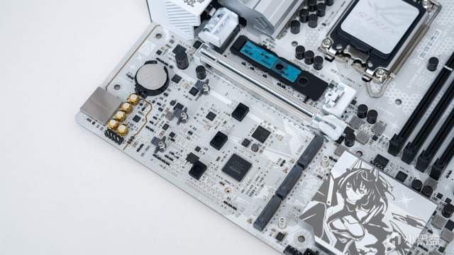 這次更新的ROG B860小吹雪主板我覺得最大的亮點就是提供了4個M.2 SSD接口設計,這樣也使得主板底部覆蓋了超大面積散熱裝甲。裝甲上還點綴了吹雪姬的剪影元素設計。