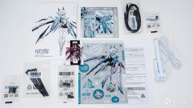 所有的附件,ROG 吹雪姬主題的貼紙、說明書、主題卡片、全新易拆式天線、SATA 數據線、M.2滑軌卡扣、理線紮帶。