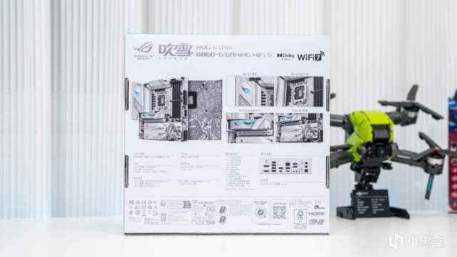 包裝方面整體採用更清爽的配色設計,包裝上採用冰雪場景搭配吹雪姬點綴。產品型號爲:吹雪 ROG STRIX B860-G GAMING WIFI S。