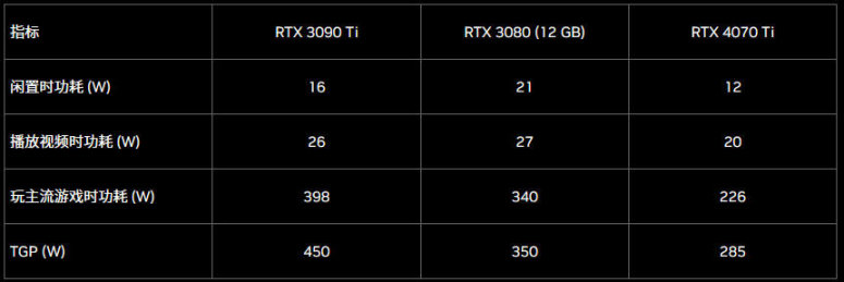除此之外,比RTX 3090Ti更快时,RTX 4070Ti在玩游戏时平均功耗也降低了 43%,仅为226W,而3090Ti的相应功率为398W。当RTX 4070Ti处于闲置、网页浏览或观看视频的状态时,其功耗非常低。