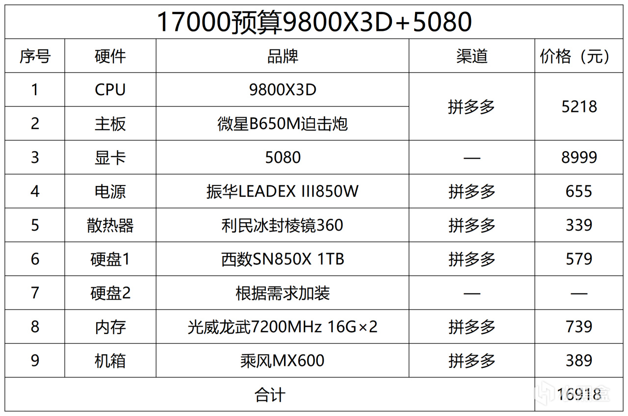 17000預算推薦9800X3D+5080,正常情況下我會建議顯卡到90級別再考慮9800X3D,但是5090D和5080的差價實在是太大了,對於大部分人我還是建議80止步,5090的價格貴了一倍,到這個價位的配置也不太考慮性價比了,存儲還是標準的32G+1TB,不夠可以再加。