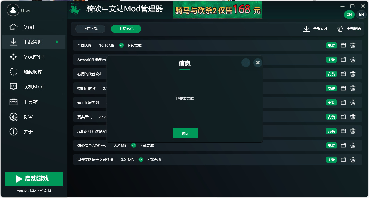 3.打開MOD管理器,將遊戲版本調整爲1.2.12(記得看自己騎砍2版本號,MOD管理器左下角就有),在搜索欄中搜索我提供的MOD列表,挨個下載。