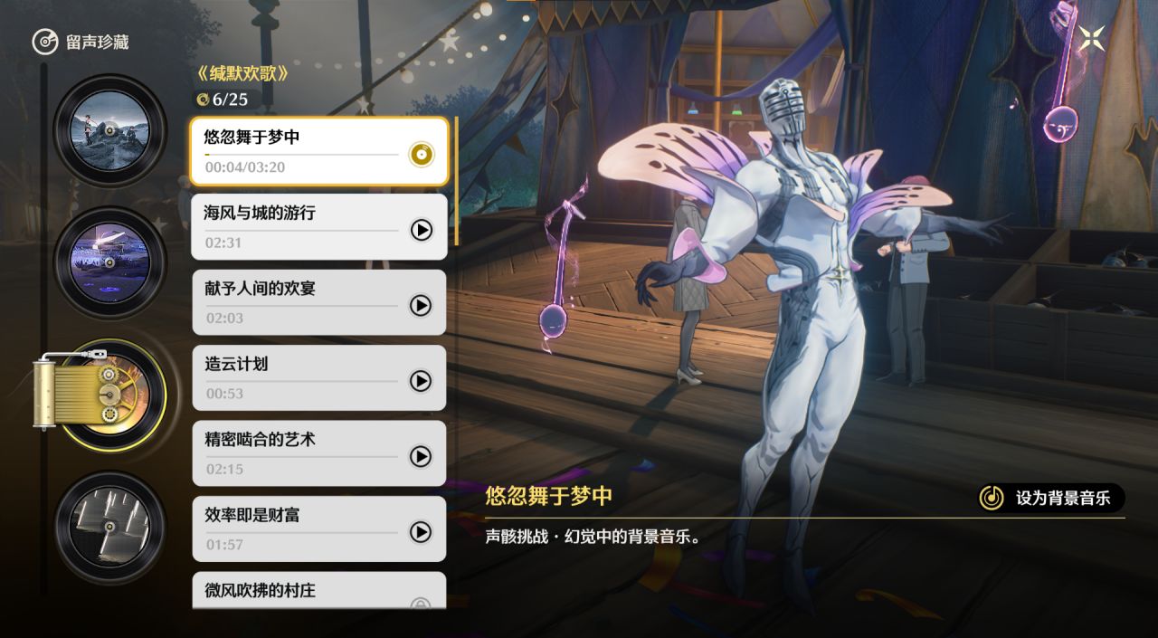 而在首次經歷這夢幻般的體驗後,還會收到羅蕾萊留給玩家的禮物,以及一張珍貴的唱片,即是挑戰中的背景音樂。可在遊戲內通過“留聲珍藏”處的聲骸回放