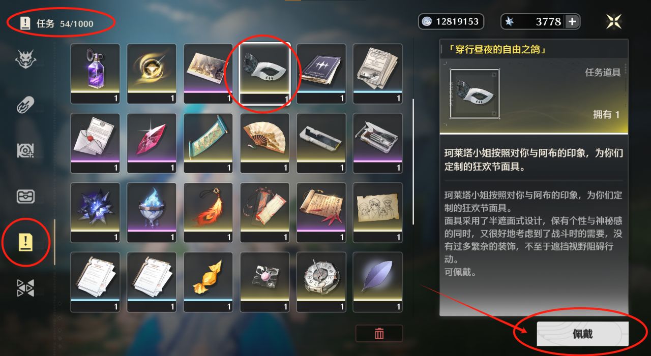 劇情中,二小姐珂萊塔爲阿漂定製的面具“穿行晝夜的自由之鴿”,可隨時在揹包中裝備,裝備後主角的外觀也會同步戴上這個面具,不僅限於任務劇情中