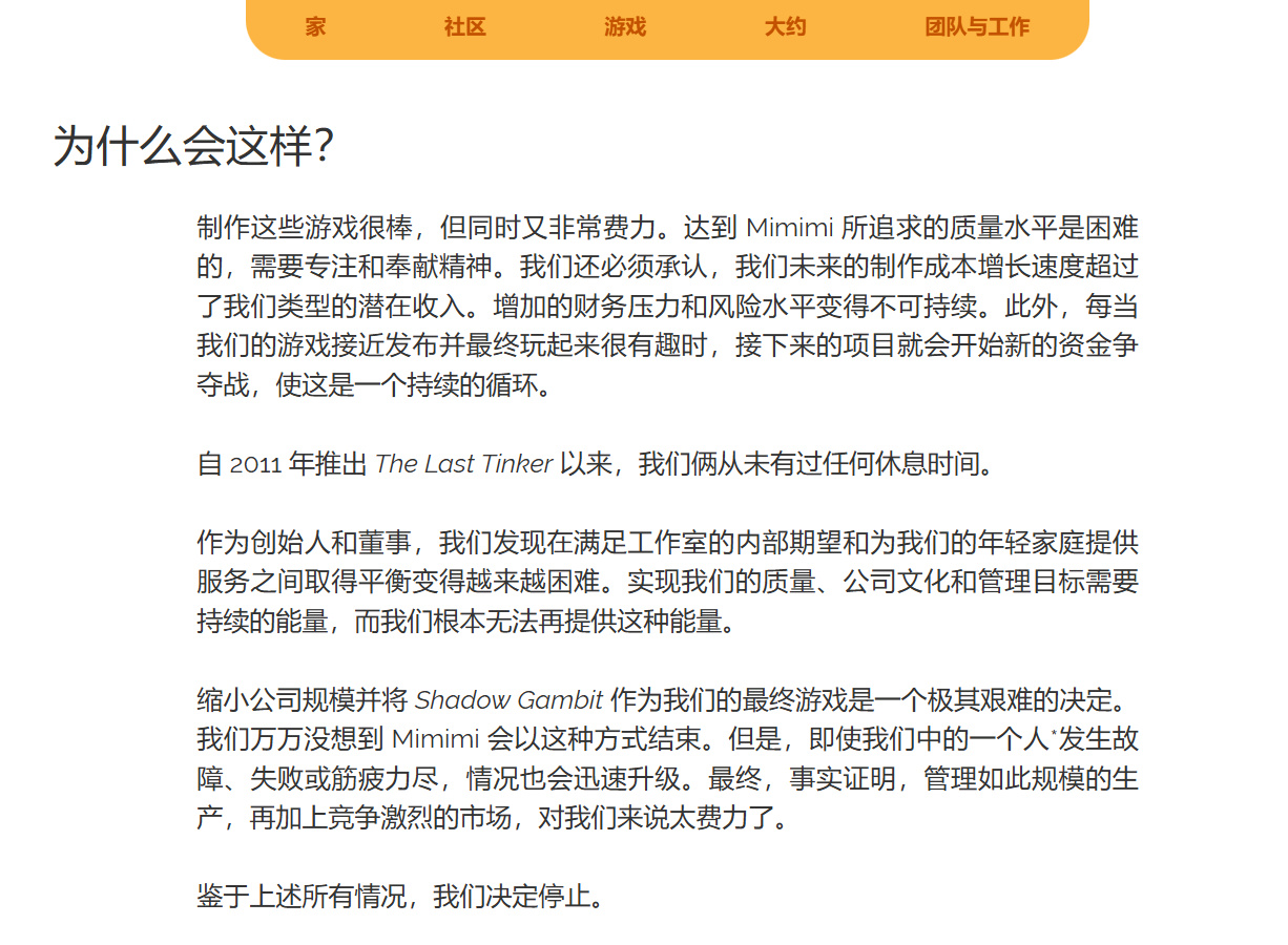影子诡局发售的12天后Mimimi在官网发出公告,称影子诡局会是他们最后一款游戏,在接下来的几个月里他们会在保证作品正常更新的情况下慢慢缩小规模直到解散。