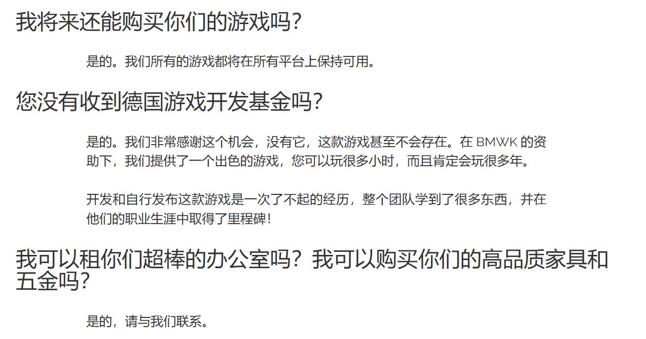 最后创始人在信中感谢了社区与粉丝群体的喜欢;感谢了行业同行的帮助;感谢了过往发行商的助推;感谢了合作伙伴的努力,除此之外还感谢了给予资金支持的基金会与德国游戏的资助。