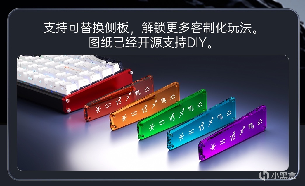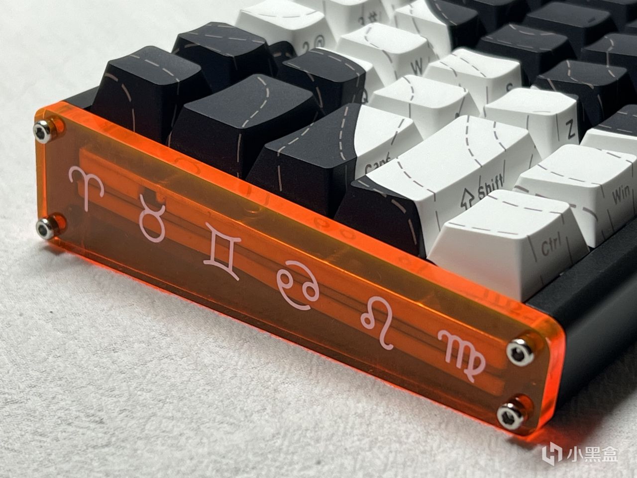 甚至可能是为了迎合这个心机设计,黑爵这次首发附赠的两块铭牌就是彩色的透明亚克力板,上方画着星座符号,当装上去时,透过亚克力板可以直接看到键盘内部,非常有意思。