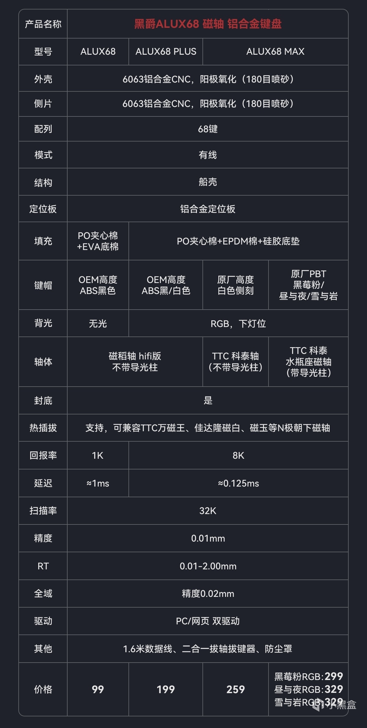 除此之外,这次的ALUX68系列还有99\199\259\299版本,具体配置表我放在下图了。