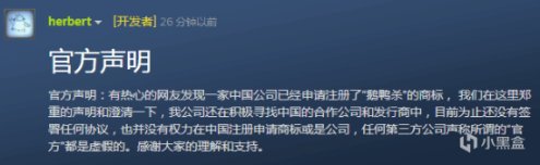 官方声明: 有热心的网友发现一家中国公司已经申请注册了“鹅鸭杀”的商标, 我们在这里郑重的声明和澄清一下,我公司还在积极寻找中国的合作公司和发行商中,目前为止还没有签署任何协议,也并没有权力在中国注册申请商标或是公司,任何第三方公司声称所谓的“官方”都是虚假的。感谢大家的理解和支持。