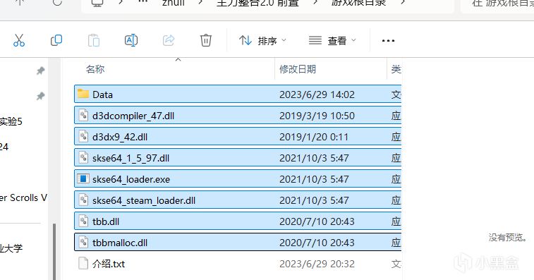 這裏和新手教程的流程不一樣,我們打開”主力整合2.0 前置“文件夾,打開”遊戲根目錄“文件夾,選中介紹外的所有文件,複製,然後粘貼到老滾5根目錄內(注意是複製文件目錄)就OK了